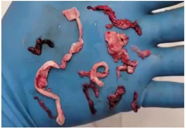 上图是《尸检发现接种疫苗的人体内有大量血凝块生物结构》文章里的实物照片,稍有常识的人都知道这根本就不是血液的凝集物,而是“蛋白样物质”呈透明的凝胶或果冻状,坚韧的纤维状并且具弹性。这些“蛋白样带状物质”位于血管和动脉中,一旦堵塞血管立刻造成器官或组织坏死,甚至直接导致死亡。上图片的“血栓”干燥后的样本是这样的: