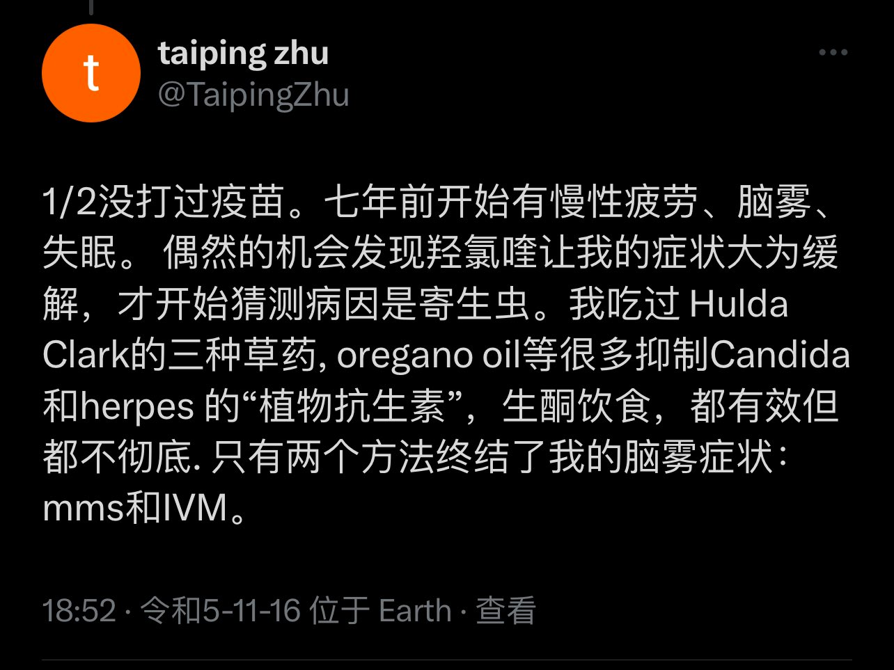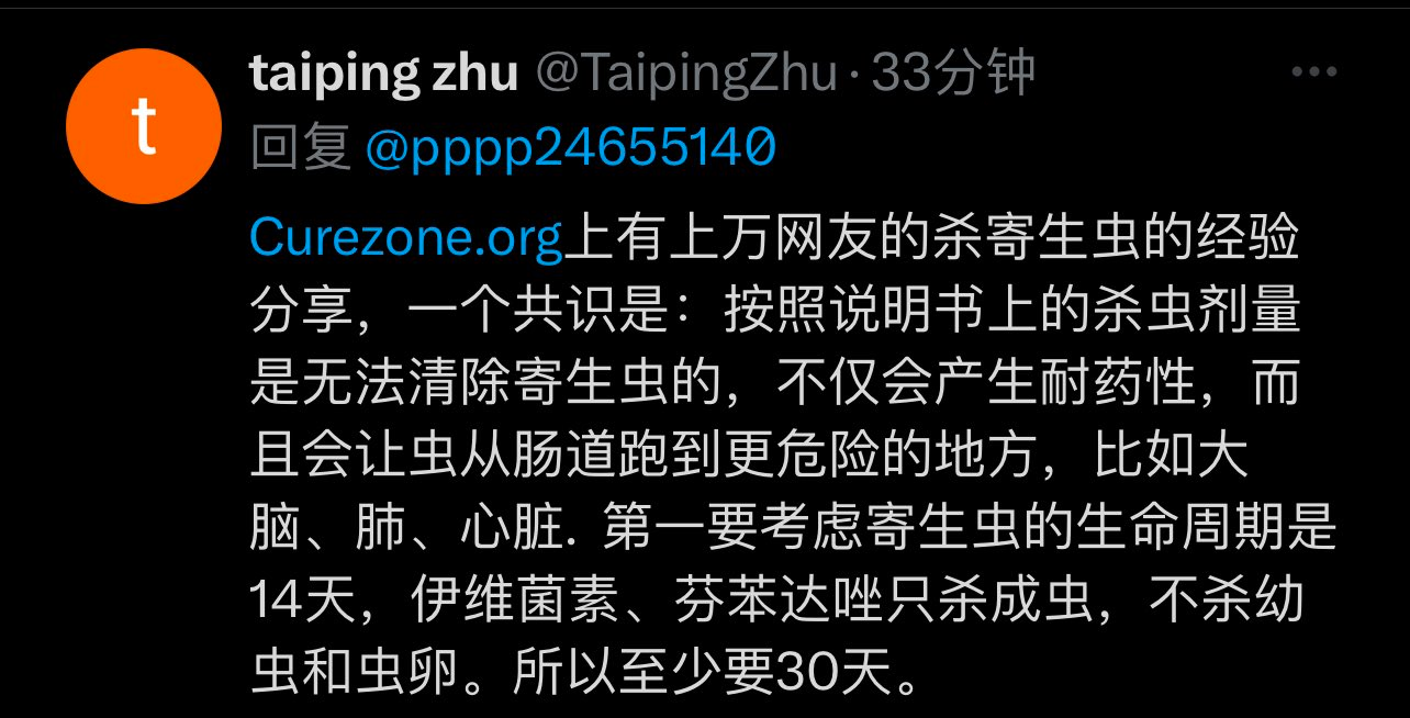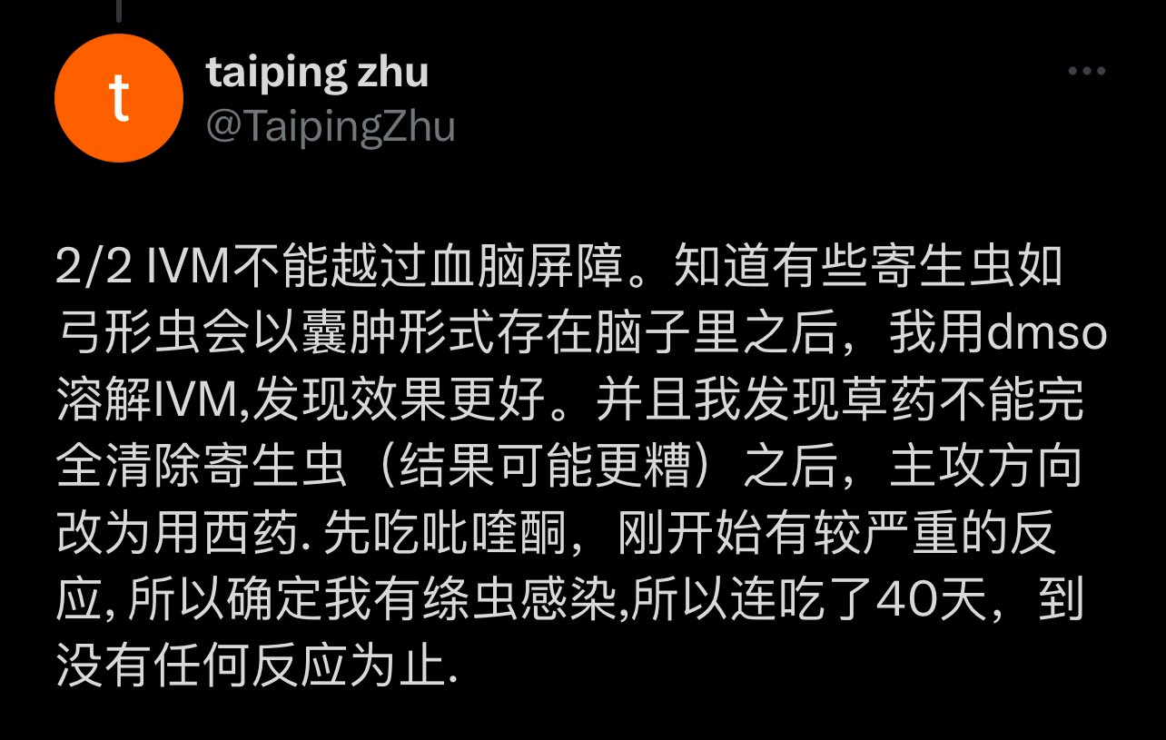 伊维菌素 治疗方案 脑雾、慢性疲劳、失眠等症状有可能体内多寄生虫,伊维菌素芬苯达唑用药参考 By CCHK 2024 年 1 月 20 日 Search Search for: CTA Title CTA Content Follow Us Join Our Community 重要!!!看一下这位推友的经验: 如果体内有很多寄生虫,按说明书来,只吃四颗伊维菌素是不够的,需要多疗程 该推友的症状是脑雾、慢性疲劳、失眠通过多疗程多管齐下的杀虫治疗,大为改善看来吃多少还是得因人而异,不过进一步证明了处理寄生虫问题的必要性. Read Also: 正在发生 疫苗信任危机:公众觉醒推... Technology The Ultimate... 综合分享 绝对计数:T淋巴细胞亚群... Sports Interview wi... 病案更新 问:27岁(女),四针疫... Politics Technologica... 伊维菌素 罗伯特·F·肯尼迪三世任... Post Activity 24302 Share this post 0% Back to Top