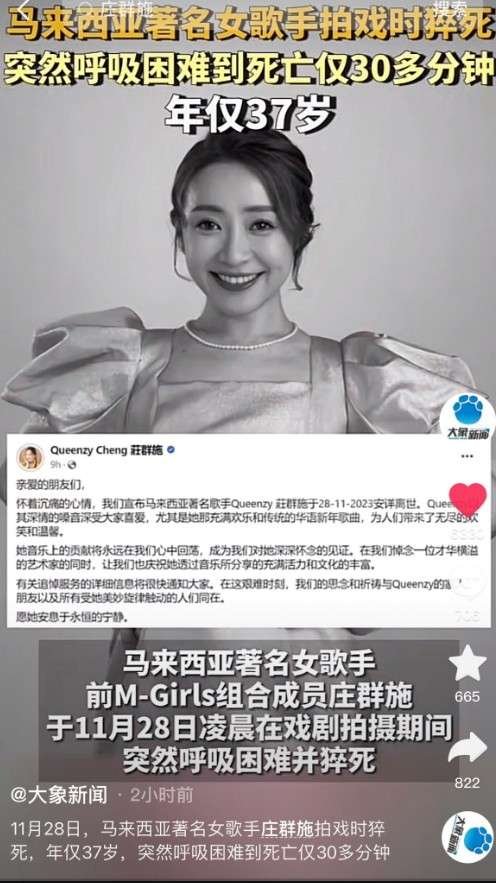 2023年11月28日,马来西亚著名女歌手庄群施拍戏时猝死,年仅37岁,突然呼吸困难到死亡仅30多分钟。她打了四针新冠疫苗。