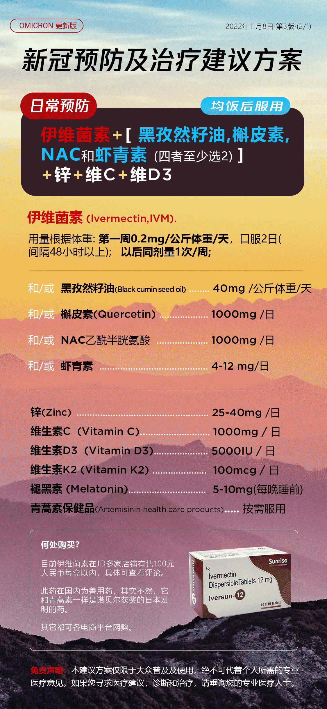 ▲2023年元旦Eglise医生的建议:1)伊维菌素和硫酸羟氯喹可预防病毒或在早期抑制病毒复制;2)阿奇霉素可有效治疗下呼吸道感染;3)青蒿衍生物可作为早期抗病毒复制类药物;4)预防重于治疗,发现症状早服药。免责声明:不能代替任何专业医疗诊断或治疗意见。